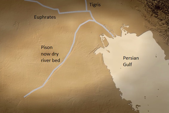 The Persian Gulf didn’t exist in the Ice Age and was once dry land. During the Ice Age, the sea level was 200 feet deeper. Due to the runoff, the Gulf filled with water, and is just 120 feet deep at it’s deepest point. Zarins believes this river is the Pison, which flowed much further east near Basra.